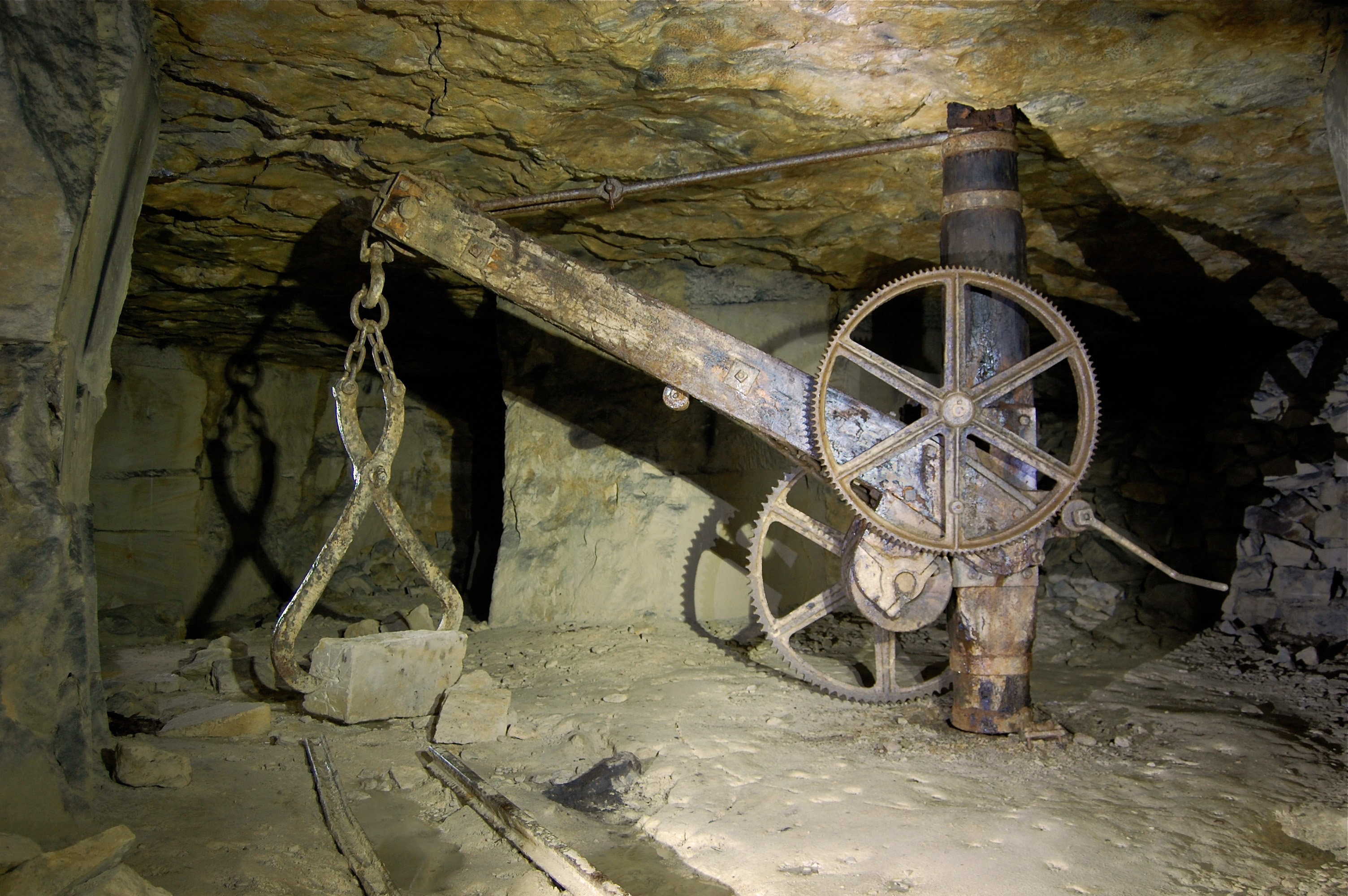 From the Victorian times onwards, cranes were an essential part of the quarrying process in the underground Bath Stone quarries. They were used to lift the blocks of stone cut from the working face onto carts, which were then pulled to the surface by horse or donkey; or later, the transport was provided by small locomotives.
